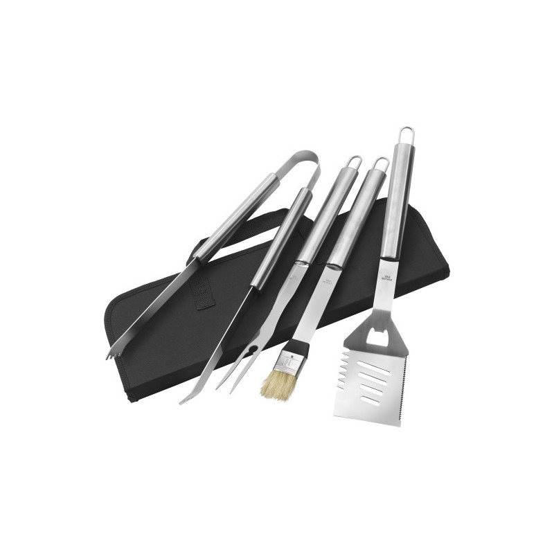 Rostfritt set i fyra delar med fodral av nylon. Innehåller grillspade, pensel, tång och gaffel. Praktisk att ta med då fodralet är utrustat med dragkedja och kraftiga bärremmar.