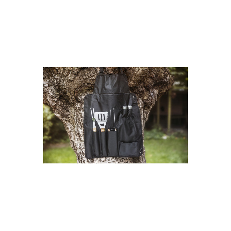 Grillset i 6 delar med rostfria verktyg och ett svart förkläde i nylon (600D). Grillgaffel, stekspade, tång samt salt och peppar.