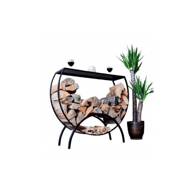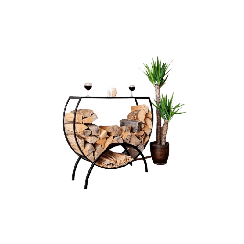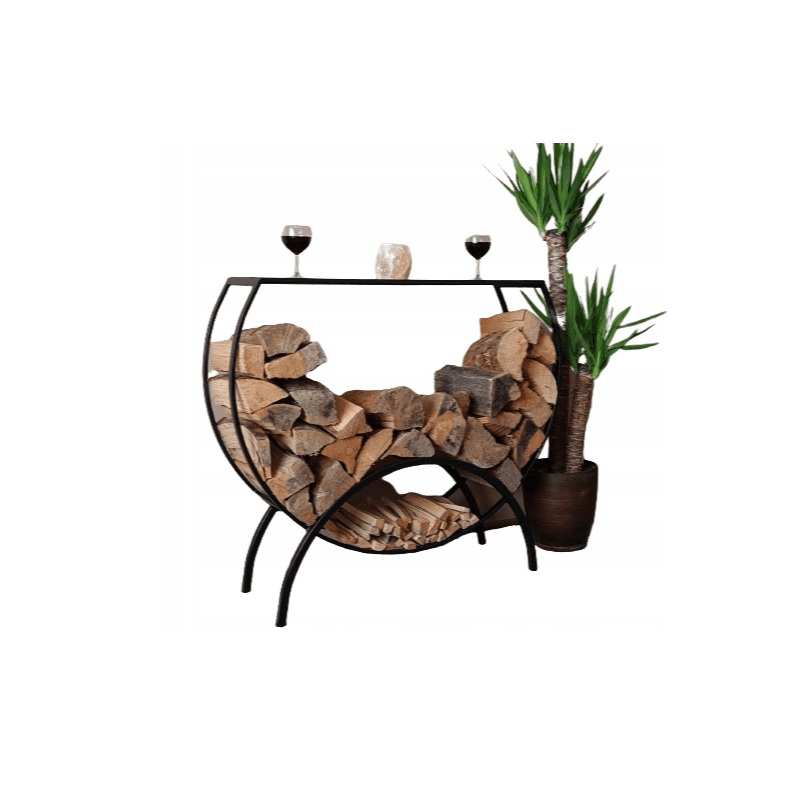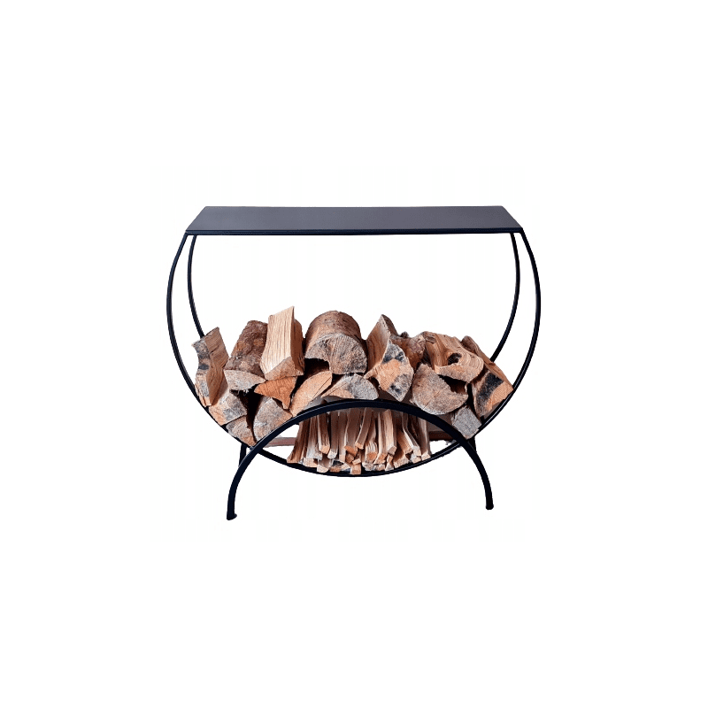 Denna halvrunda vedhylla i svart pulverlackat stÄl Àr bÄde praktisk och dekorativ. Perfekt för vedförvaring vid öppen spis eller kamin, samtidigt som den ger ett elegant och gediget intryck.