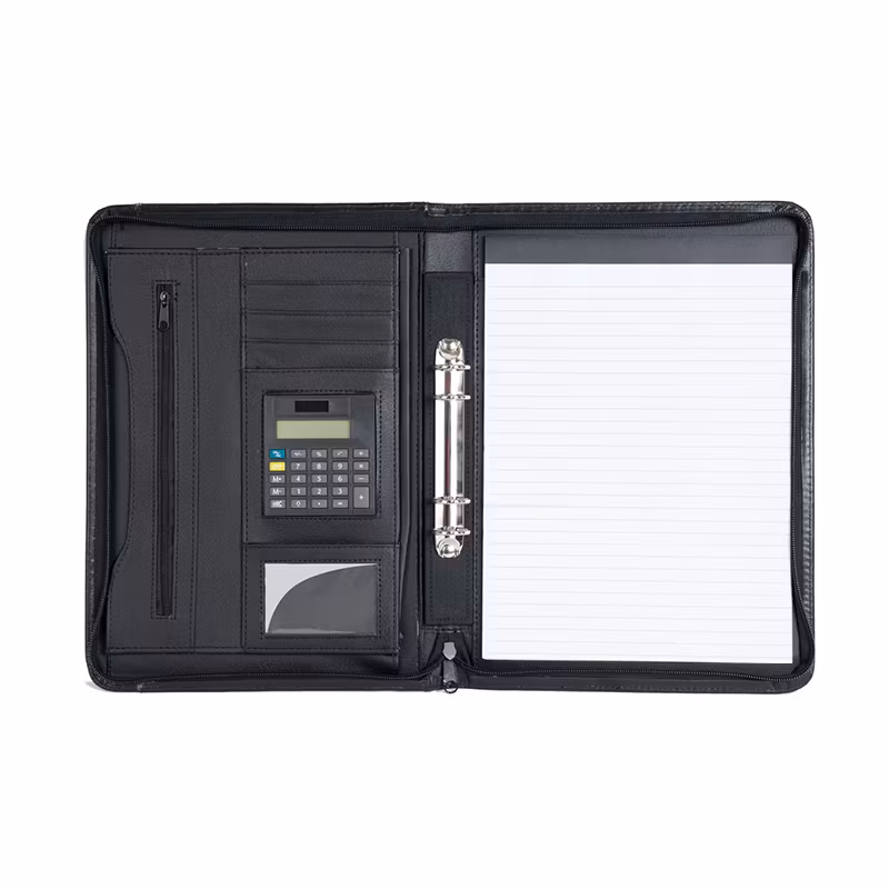 Den hÀr dokumentmappen i konstlÀder kombinerar stil, funktion och flexibilitet. Den har en dragkedja runt om som hÄller allt sÀkert pÄ plats, och en avtagbar ringmekanism som gör det enkelt att organisera dokument, byta innehÄll eller anpassa mappen efter dagens behov.