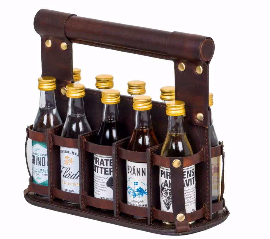 Brännö snapsväska 10 är en elegant och hållbar väska tillverkad av äkta buffelskinn. Den rymmer tio små flaskor och är perfekt för gåvor, högtider, provningar eller när du vill transportera snaps med stil.