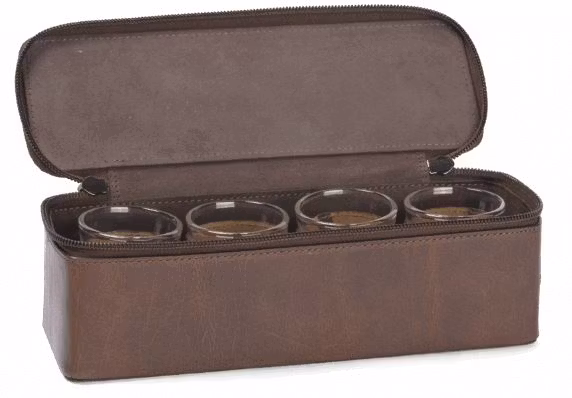 Brännö snapsväska 6 cl är en elegant och robust väska tillverkad av exklusivt, garvat buffelskinn. Den rymmer fyra snapsglas á 2,5 cl/6 cl, perfekt för högtider, gåvor, utflykter eller när du vill servera snaps med stil.