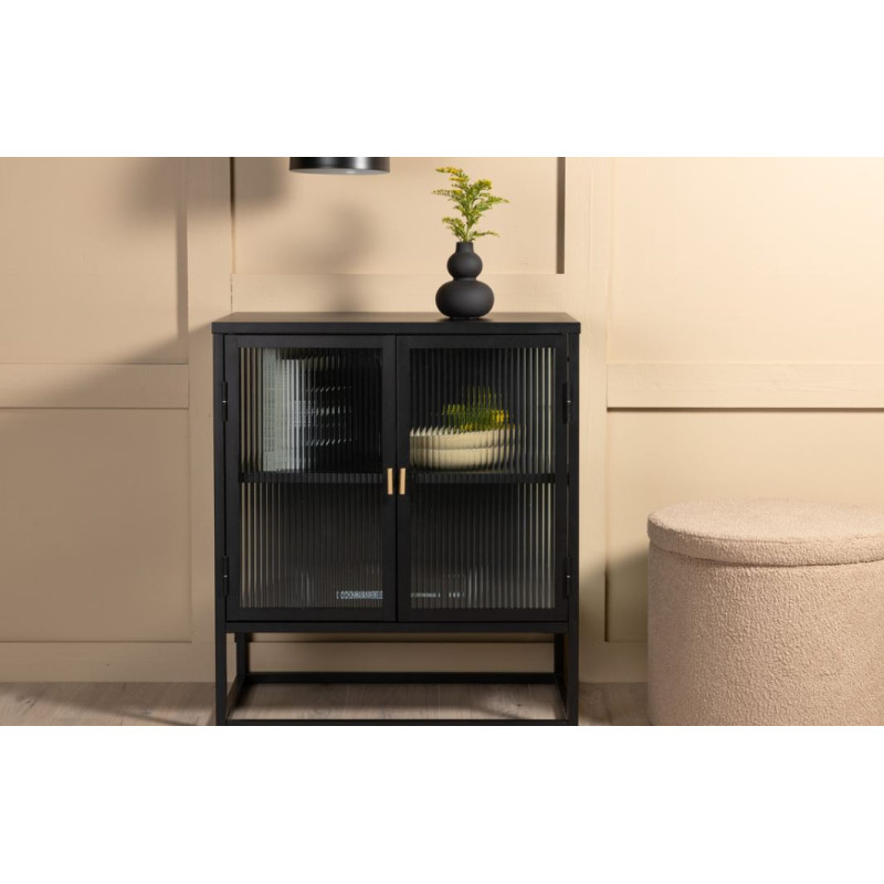 Upptäck Garis skåp i svart – en perfekt balans mellan modern elegans och funktionell förvaring. Med sina glasdörrar med veckad design och en svart pulverlackerad stålram skapar Garis en sofistikerad känsla i rummet. Det stilrena formspråket gör att skåpet passar lika bra i vardagsrum, matsal, hall eller kök.