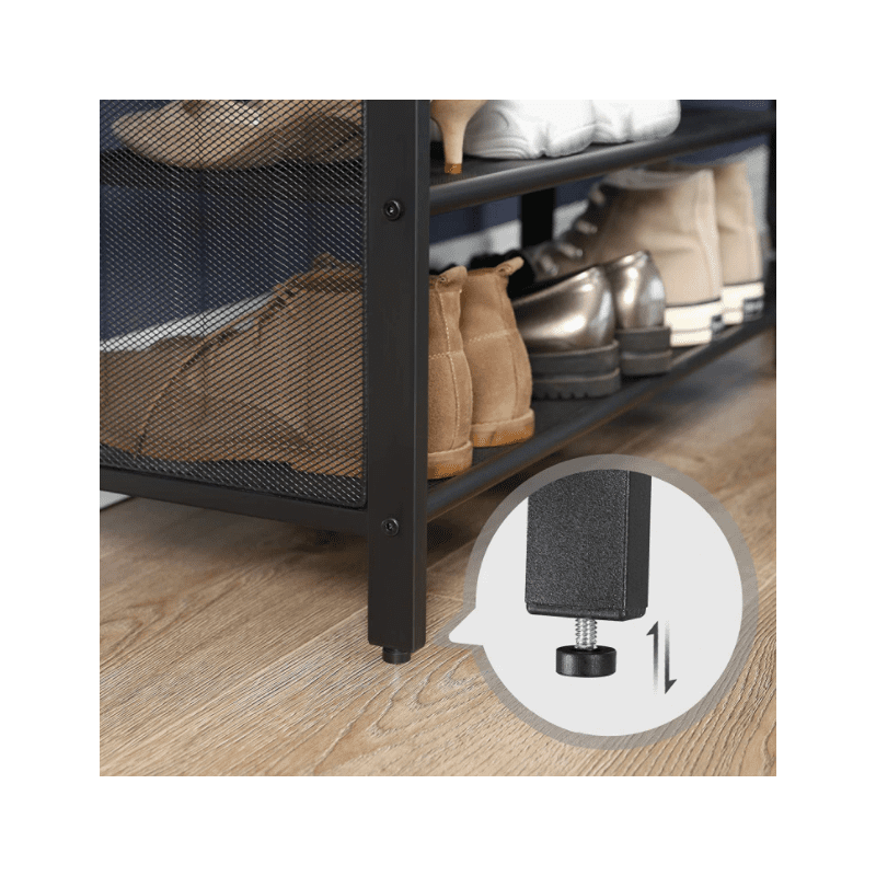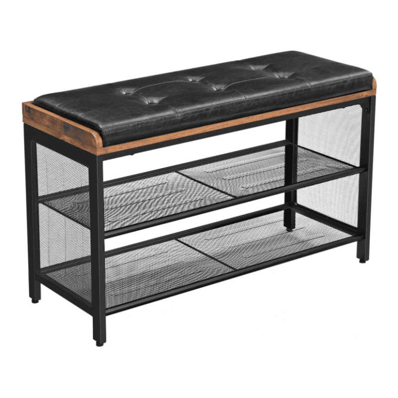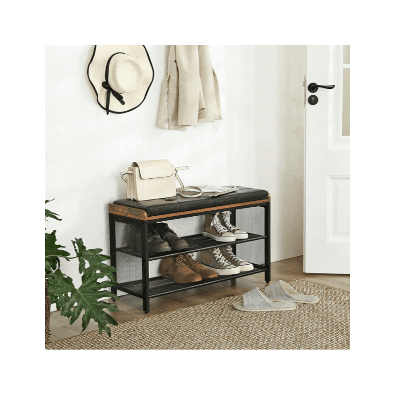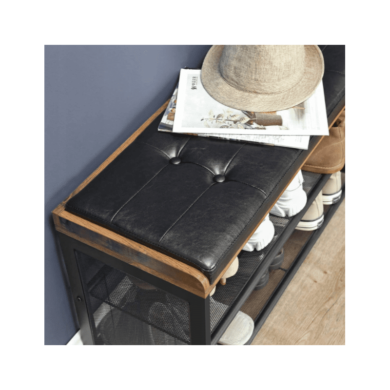 Fin och praktiskt skohylla med sittbänk, vintage industriell stil. En elegant rustik förvaringsbänk.