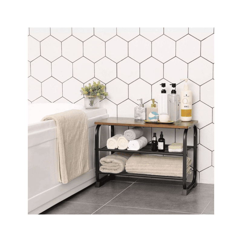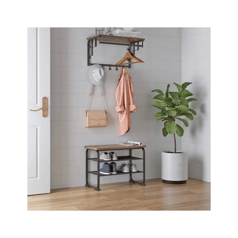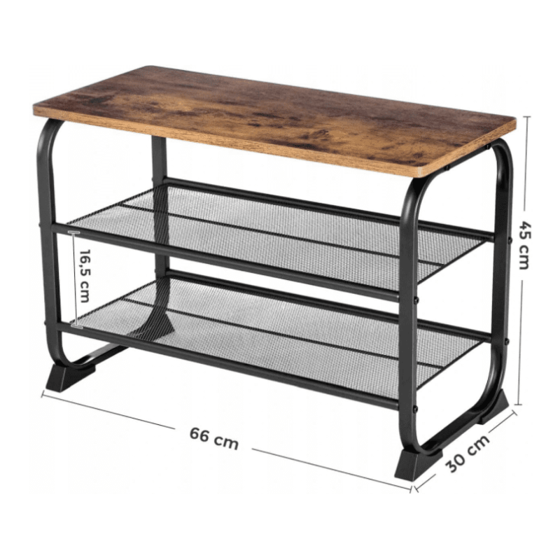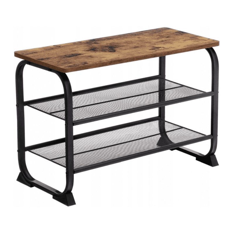Fin och praktiskt skohylla med sittbänk, vintage industriell stil. En elegant...