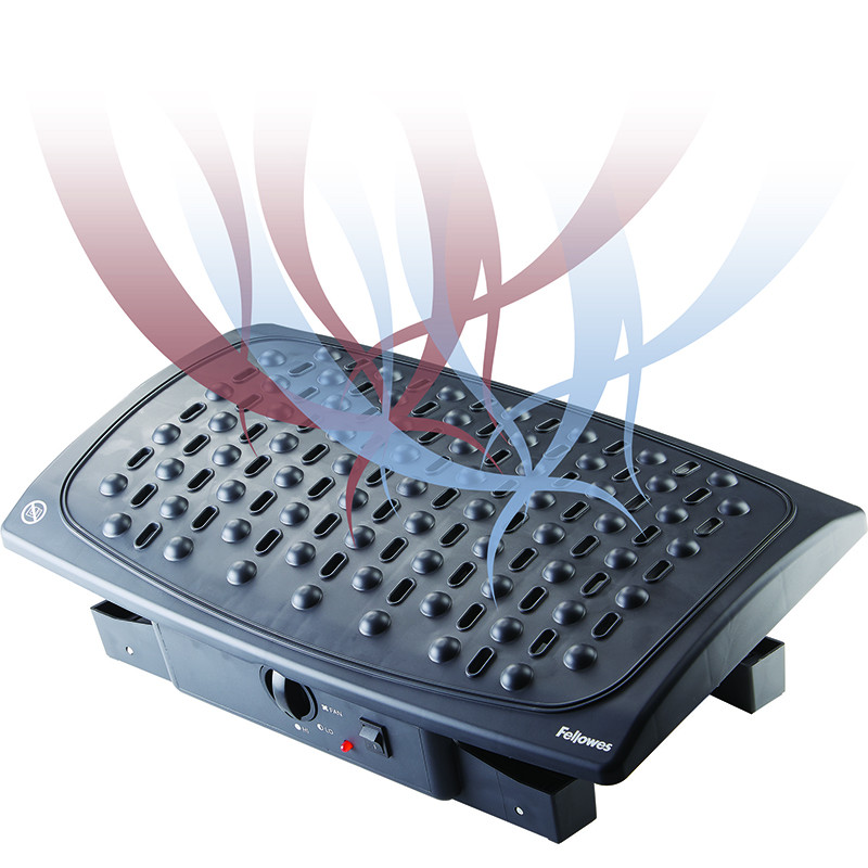 Halkfritt fotstöd från Fellowes med inbyggd fläkt som kan justeras i tre lägen: Kall luft, låg värme eller hög värme. Perfekt om du alltid fryser eller är för varm på kontoret.