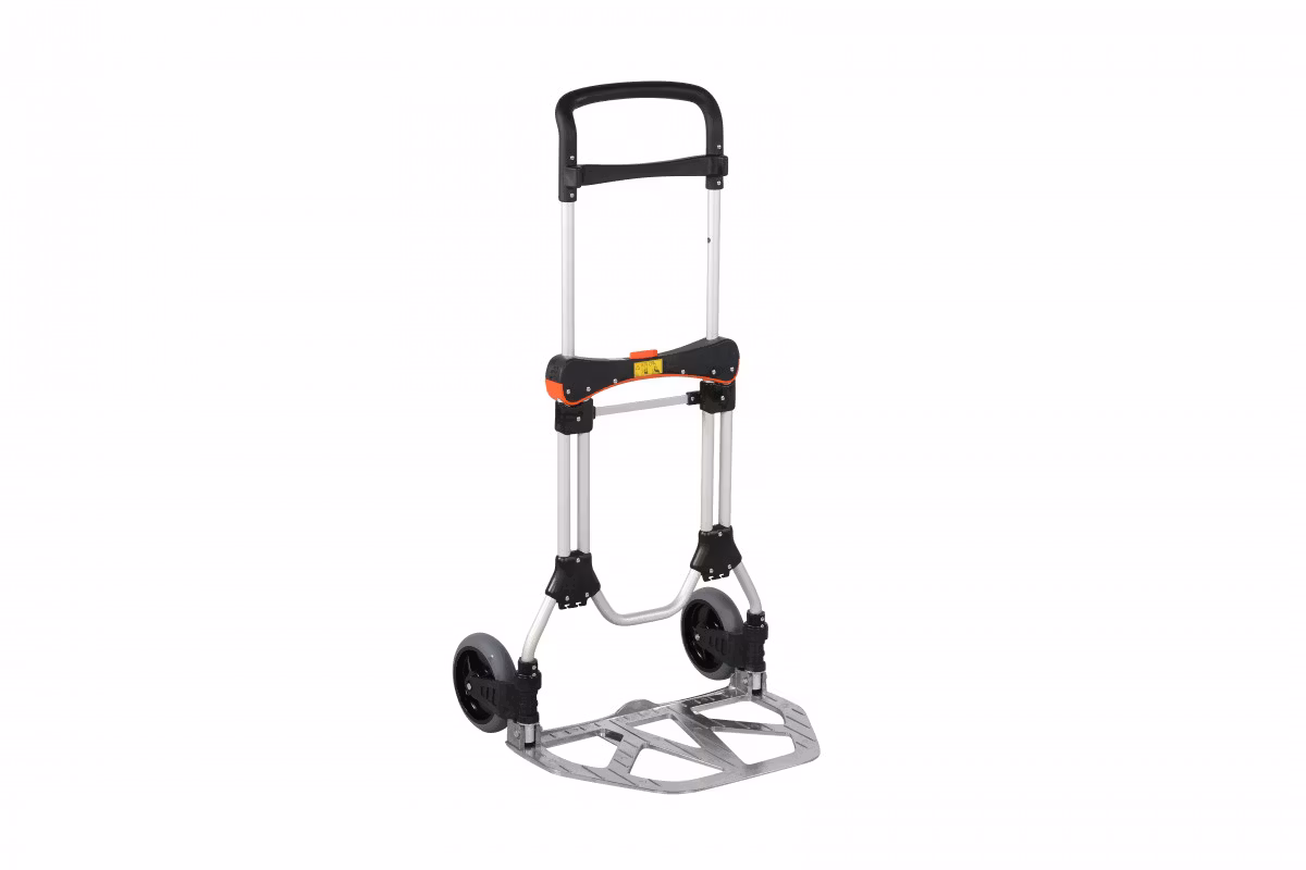 Kärran fälls ihop på några sekunder och tar minimalt med plats vid transport eller förvaring. Den stora lastplattan och de stabila hjulen i massivgummi ger trygg rullning och säker hantering även vid tyngre last. Perfekt för lager, butik, verkstad, kontor eller hemmabruk.