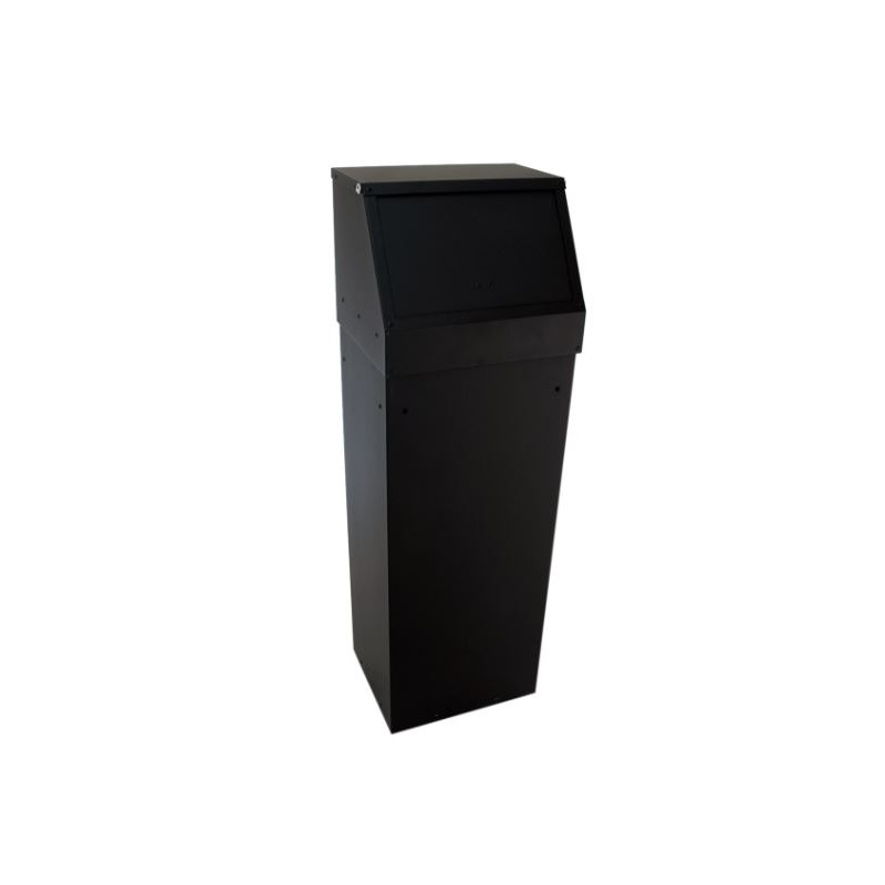 Elegant 90 L avfallstunna i svart pulverlackerad metall med vipplock och hjul. Döljer sĂ€cken och passar 125 L sĂ€ck. Leveranstid 5â7 dagar.