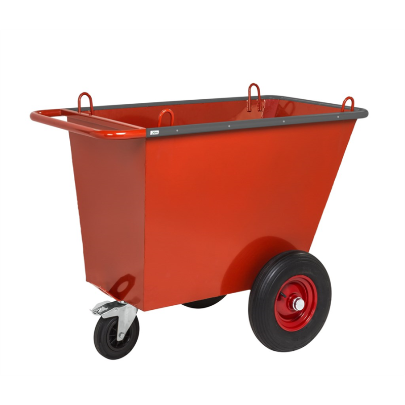 Stor avfallsvagn i kraftig plåt. Vagnarna med lyftöglor är CE märkta.