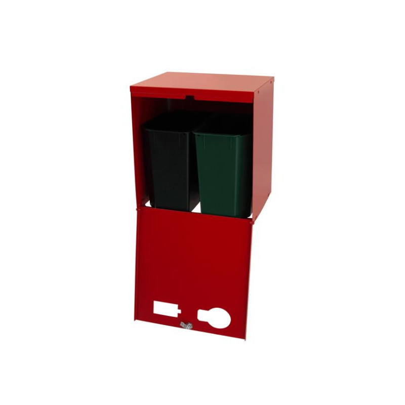 Skåpet är utrustat med två separata insatskärl à 9 liter – ett för batterier och ett för glödlampor – vilket gör det enkelt att sortera och hantera olika typer av avfall. Tack vare låset med trekantsnyckel hålls innehållet säkert och endast behörig personal har tillgång vid tömning.