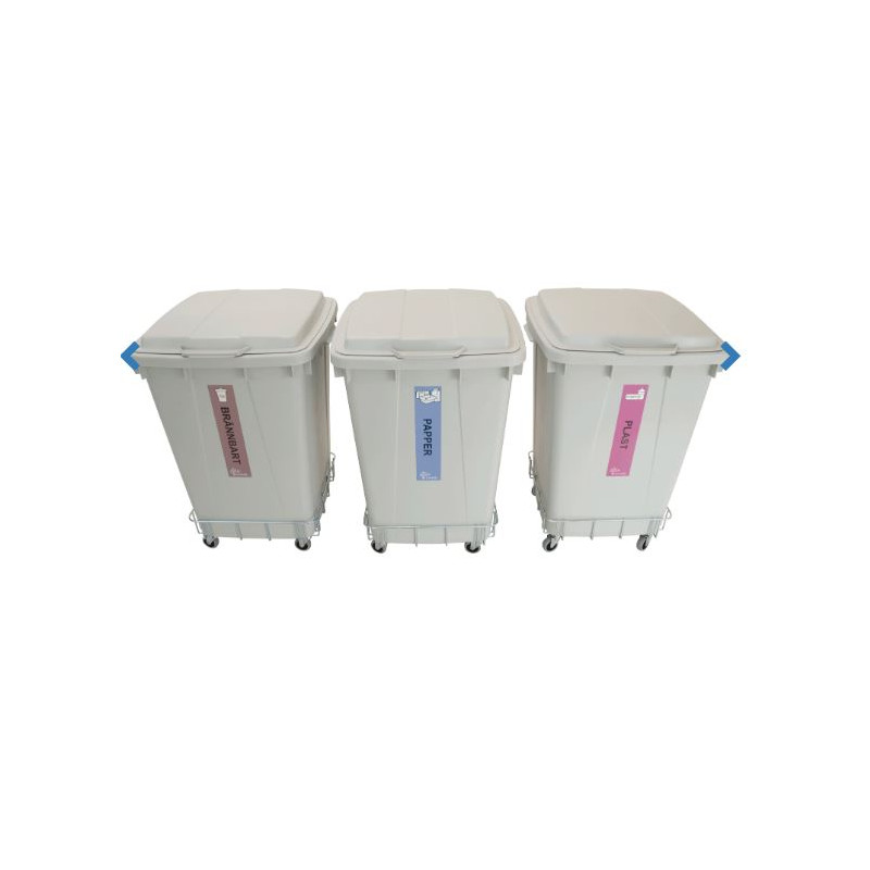 Stationen består av tre rymliga 90-literskärl i grått med matchande lock och stabila metallvagnar som gör det enkelt att flytta enheterna vid behov.