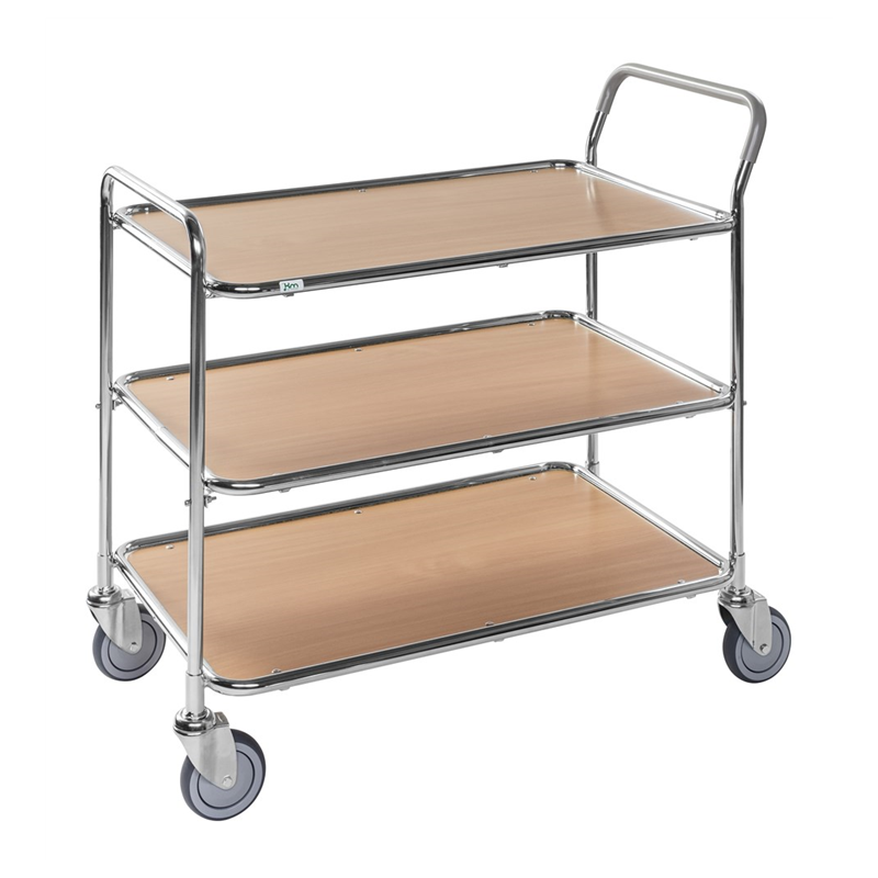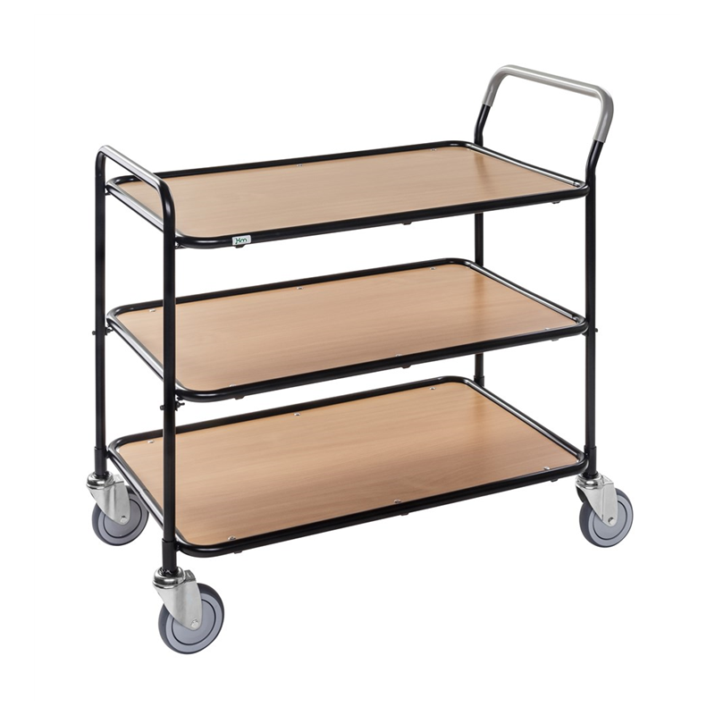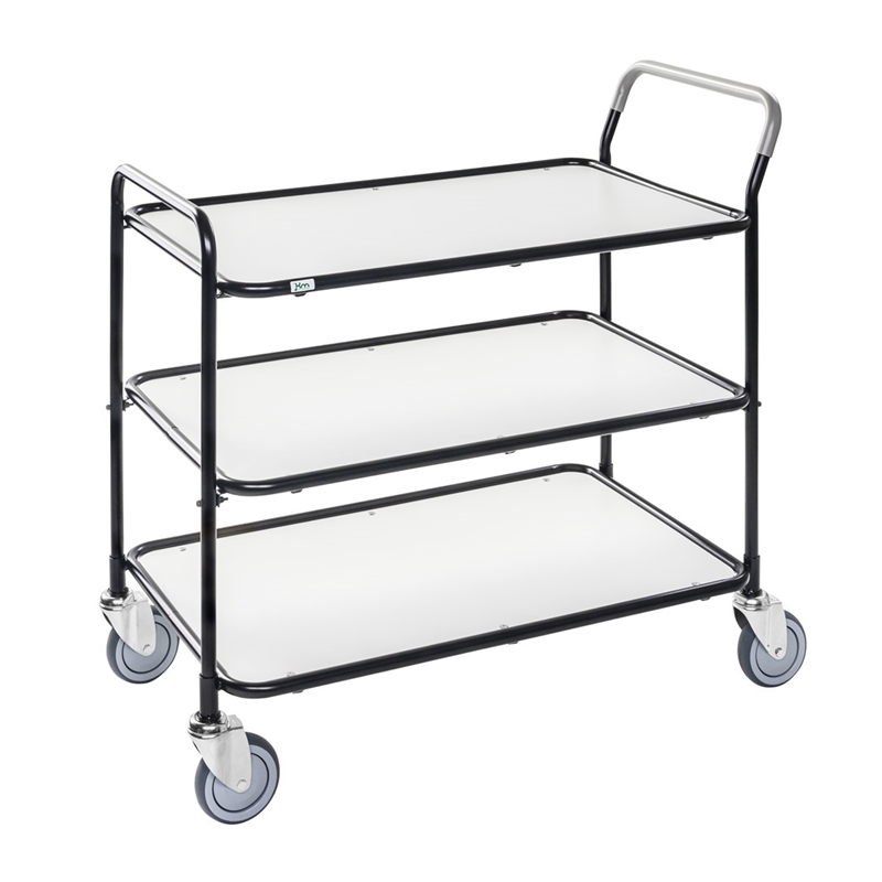 Mindre bordsvagn i 3 plan. Plastbeklätt handtag som motverkar kalla händer. Hyllplan av laminat. Levereras omonterad.