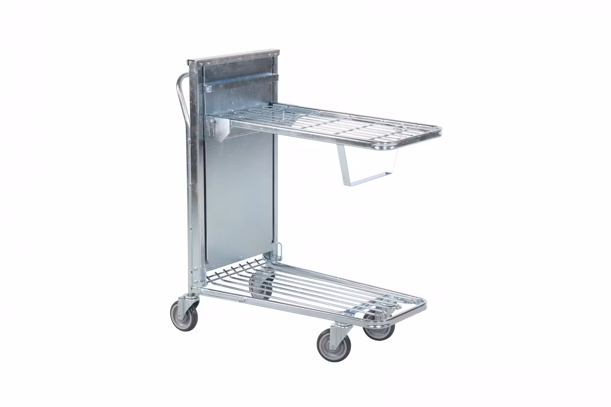 NÀr vagnen inte anvÀnds kan det översta hyllplanet enkelt fÀllas upp, vilket gör att flera vagnar kan placeras i varandra. Perfekt för att spara plats vid förvaring eller transport. Den stabila stÄlkonstruktionen och de lÀttrullande hjulen gör vagnen bÄde robust och lÀttmanövrerad i daglig drift.