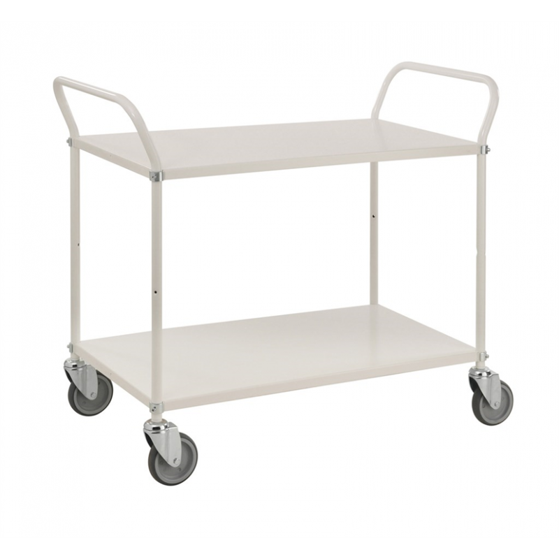 Plåtvagn i 2 plan. Hyllplanen kan monteras med kant upp eller ner efter eget önskemål. Rejäla 125mm hjul vilket gör den lätt att köra. Finns som standard i 6 modeller. Levereras omonterat.