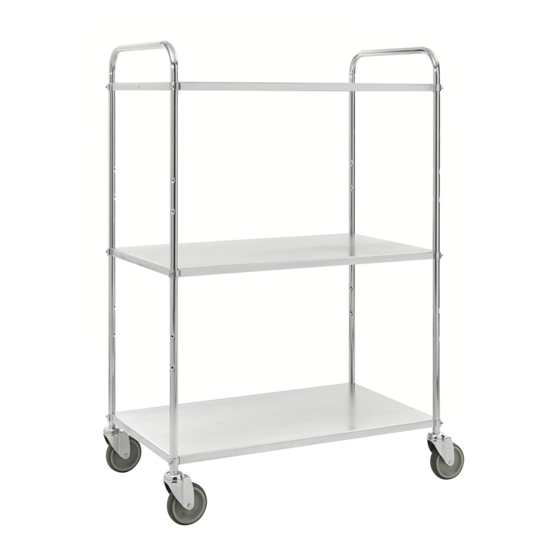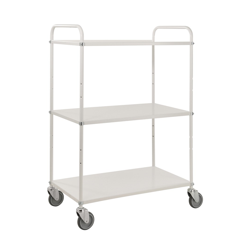 Hög plåtvagn i 3 plan. Hyllplanen kan monteras med kant upp eller ner efter eget önskemål. Rejäla 125mm hjul vilket gör den lätt att köra. Finns som standard i 6 modeller. Levereras omonterat.