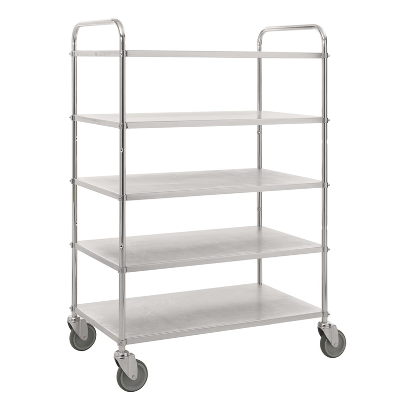 Hög plåtvagn i 5 plan. Hyllplanen kan monteras med kant upp eller ner efter eget önskemål. Rejäla 125mm hjul vilket gör den lätt att köra. Finns som standard i 6 modeller. Levereras omonterat.