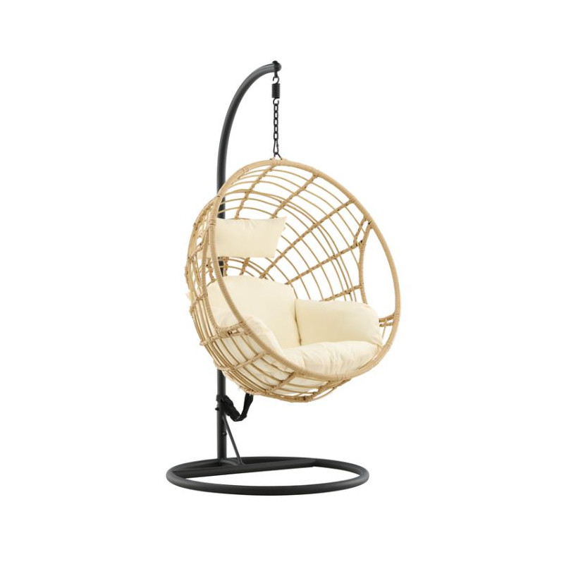 Trendig, bekväm och funktionell! Gör sommarhänget till något alldeles extra i den här läckra hängstolen från serien Viga. Designen är genomtänkt och utformad med ett stativ i svart stål och naturfärgad konstrotting där vita fluffiga kuddar ingår.