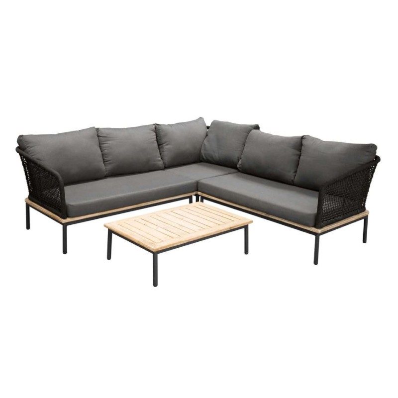 Andorra – En nätt och stilren soffgrupp i modern design. Soffgruppen består av en hörnsoffa tillverkad i en svart pulverlackerad metallram med stilfulla detaljer i akacia och en rygg i svart rep inklusive mjuka tjocka mörkgrå dynor, samt ett lågt stilrent soffbord med en bordsskiva i akacia och ett underrede i samma utförande som hörnsoffan.