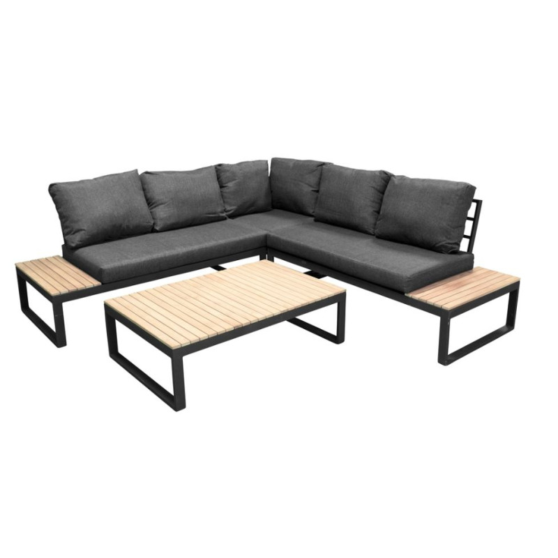Panama är en modern hörnsoffa med fyra sittplatser och en hörndel. Soffan har två stycken fasta sidobord tillverkat i svart pulverlackerad metallram samt akacia på bordsytorna. Mörkgrå dynor ingår. Skapa en charmig och iögonfallande plats på uteplatsen att samla familj och vänner kring en varm sommarkväll och njut av bekvämligheten! Skötselråd: För att dina utemöbler i Akacia/hårdträ ska bibehålla sin finish bör de oljebehandlas. Eftersom träslagen i sig inte är lika feta av naturen behöver de oljas lite då och då, även under säsong.