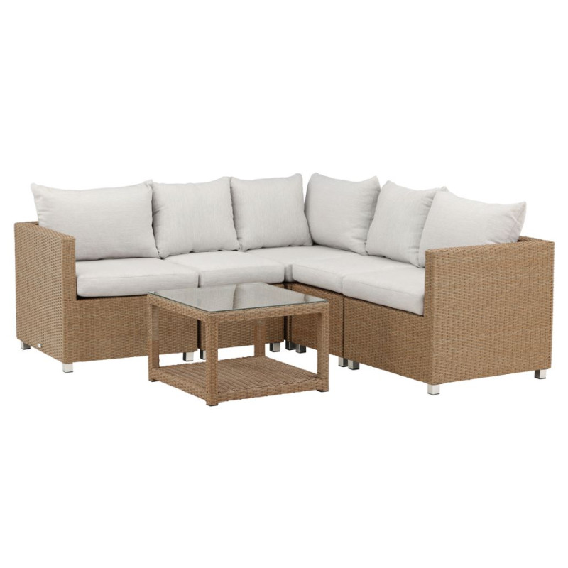 Vamos loungeset imponerar med sin lyxiga, avkopplade design och raka nordiska former. Den här soffgruppen i modern design har fokus på en god komfort till din uteplats eller altan. Soffgruppen består av en hörnsoffa med fyra sittplatser och en hörndel. Inklusive vita mjuka dynor samt ett lägre soffbord med en avlastningshylla och en stilren bordsskiva av glas. Loungesetet är tillverkat av en metallstomme och naturfärgad konstrotting. Moduler finns att köpa till. Gör er redo för ett enastående uteliv i sommar! Skötselråd: Konstrotting är ett plastmaterial som passar alldeles utmärkt för vårt skandinaviska klimat. Materialet är UV-beständigt och tåler väder och vind. Att det är UV-beständigt gör att möblerna inte bleknas, däremot rekommenderar vi alltid att förvara möblerna under ett möbelskydd eller på annat vis torrt och svalt – för att förlänga livslängden.