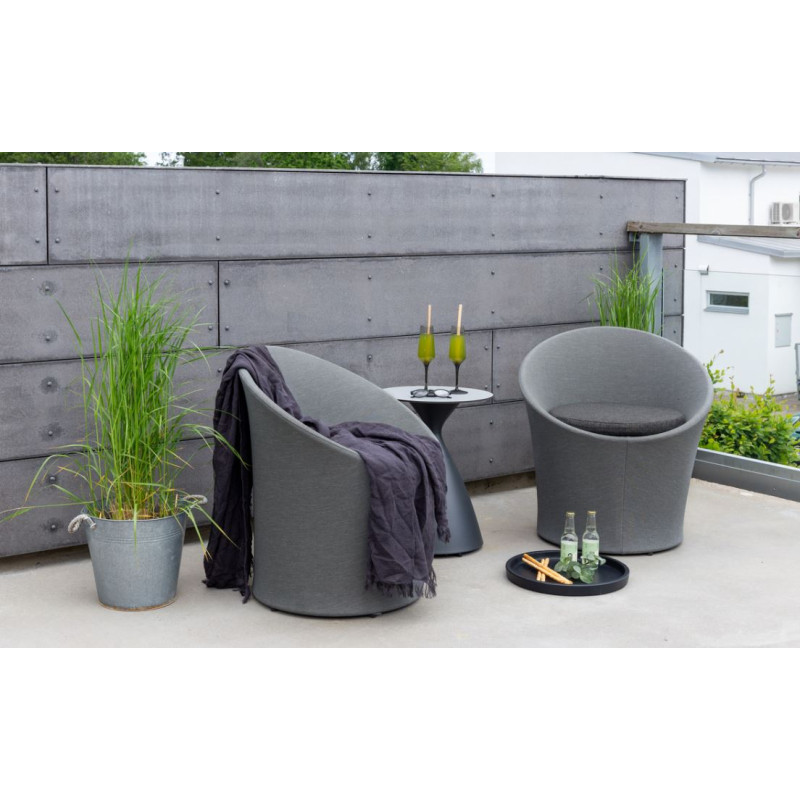 Sätt en personlig prägel på möbleringen i sommar med ett mysigt loungeset från serien Spoga i modern design. De runda formerna skapar en inbjudande och bekväm look, stolarna har en läcker grå kulör, tillverkade av tyg, och det matchande nätta bordet är i svart aluminium.