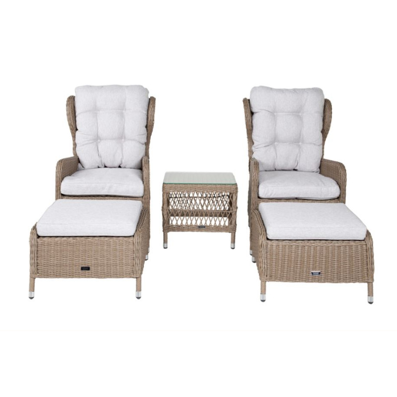 Exklusivt loungeset med en kombination av tidlös design och en fantastisk komfort till din uteplats eller altan. Washington Loungesetet består av två reclinerfåtöljer, två fotpallar inklusive mjuka sandfärgade pickerade dynor samt ett sidobord med en bordsskiva av glas.