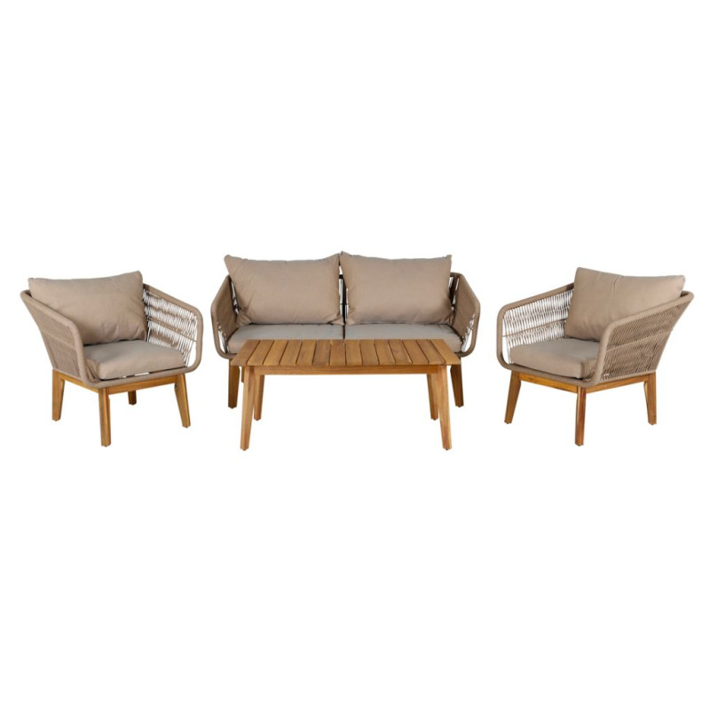 Chania – en trendig soffgrupp med fokus på bekvämlighet och iögonfallande design. Soffgruppen består av en tvåsits soffa, två karmfåtöljer inklusive tjocka slitstarka dynor i beige kulör. Till soffan ingår även ett lågt soffbord, genomgående tillverkat i vacker akacia. Soffgruppen är tillverkad med en stomme i aluminium och ben i akacia samt är rygg och sidor flätade i ett naturfärgat rep som ger en lyxig design. Soffgruppens detaljer i akacia tillsammans med soffbordet skapar en exklusiv helhetskänsla. Gruppen rymmer totalt 4 sittande gäster. Bordets mått: 110x60x45 cm. Soffans mått: 164x75x76 cm. Sittmått: 135x65x33 cm.