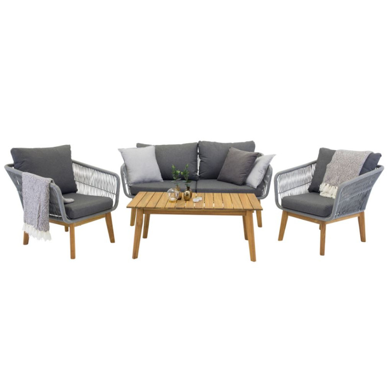 Chania - en trendig soffgrupp med fokus på bekvämlighet och iögonfallande design. Soffgruppen består av en tvåsits soffa, två karmfåtöljer inklusive tjocka slitstarka mörkgrå dynor. Till soffan ingår även ett lågt soffbord tillverkat helt i vacker acacia. Soffgruppen är tillverkad med en stomme i aluminium och ben i acacia samt är rygg och sidor flätade i ett ljusgrått rep som ger en stilren design. Soffgruppens detaljer i acacia tillsammans med soffbordet klassiska utformning skapar en exklusiv helhetskänsla. Skötselråd: För att dina utemöbler i Akacia/hårdträ ska bibehålla sin finish bör de oljebehandlas. Eftersom träslagen i sig inte är lika feta av naturen behöver de oljas lite då och då, även under säsong. Nyinköpta möbler ska mättas med olja, applicera flera lager efter varandra så maximalt med olja absorberas. Torka bort det som blir överflödigt.