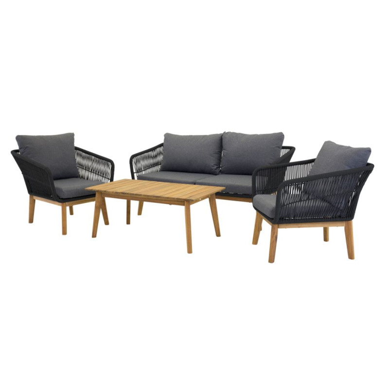 Chania - en trendig soffgrupp med fokus på bekvämlighet och iögonfallande design. Soffgruppen består av en tvåsits soffa, två karmfåtöljer inklusive tjocka slitstarka mörkgrå dynor. Till soffan ingår även ett lågt soffbord, genomgående tillverkat i vacker akacia. Soffgruppen är tillverkad med en stomme i aluminium och ben i akacia samt är rygg och sidor flätade i ett svart rep som ger en lyxig design. Soffgruppens detaljer i akacia tillsammans med soffbordet skapar en exklusiv helhetskänsla. Skötselråd: Våra rep är kvalitetsspunna polyesterrep som är lätta att rengöra. Möblerna är behandlade för att klara 500-2000 timmar. Vi rekommenderar såpa och vatten för rengöring. Låt lufttorka.