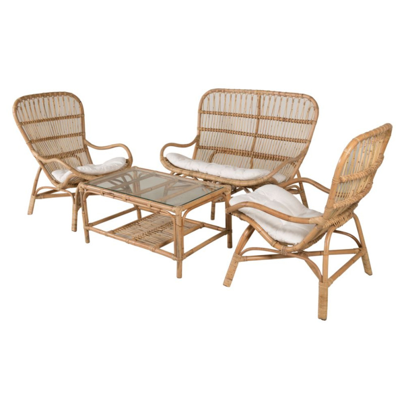 Loungegrupp Ella, en inbjudande möbelgrupp med inriktning på komfort tillverkat i stark och tålig naturrotting - passar perfekt på den inglasade uteplatsen. Möbelgruppen består av en tvåsitssoffa, två karmfåtöljer med fina detaljer inklusive vita pickerade sittdynor. Det tillkommer även ett rektangulärt soffbord som har en stilren bordsskiva av glas och en mindre hylla perfekt för avlastning. Det naturliga materialet ger varje enskild möbel en unik karaktär och skapar ett varmt blickfång. Skötselråd: Ett naturmaterial som är otrolig snyggt och trendigt, däremot inte särskilt väderbeständigt. Rottingmöbler ska helst inte stå utomhus utan bör placeras i torra utrymmen. Undvik stora temperaturskillnader. Enklaste rengöringen sker med fuktig trasa.