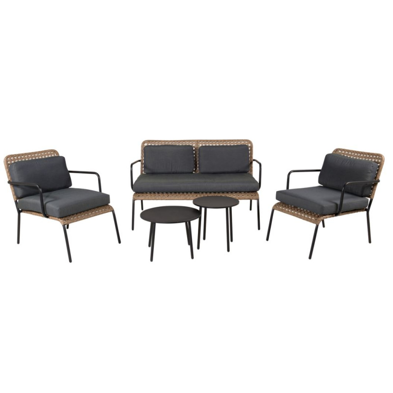 En modern soffgrupp med inriktning på komfort som passar perfekt på den inglasade uteplatsen. Möbelgruppen består av en tvåsits soffa, två karmfåtöljer tillverkat i svart pulverlackerad metall samt rygg och sits är designat i ett snyggt mönster av natur rotting. Möbelgruppen kommer med svarta dynor samt runda svarta satsbord i set om två delar. Det naturliga materialet ger varje enskild möbel en unik karaktär och dess mönster kommer dra blickarna till sig. Lättare montering krävs. Skötselråd: Konstrotting är ett plastmaterial som passar alldeles utmärkt för vårt skandinaviska klimat. Materialet är UV-beständigt och tåler väder och vind. Att det är UV-beständigt gör att möblerna inte bleknas, däremot rekommenderar vi alltid att förvara möblerna under ett möbelskydd eller på annat vis torrt och svalt – för att förlänga livslängden.