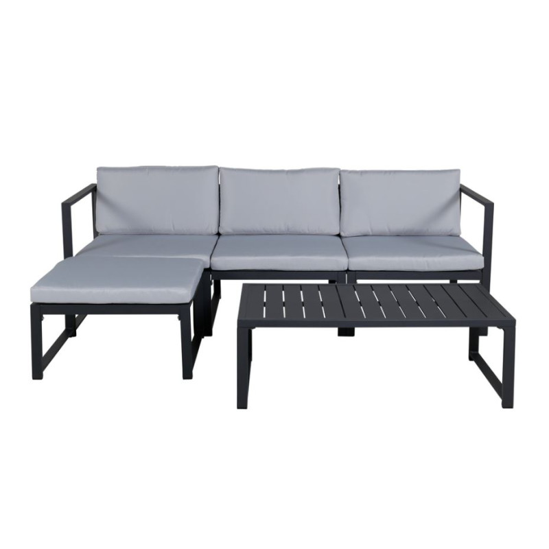 Salvador är en stilren soffgrupp i en snygg och enkel design. Soffgruppen består av en tresits soffa med divandel samt ett soffbord. Tillverkad i svart pulverlackerad metall och aluminium - enkelt att sköta och tåligt för utomhusbruk! Mjuka ljusgrå dynor inkluderas till soffgruppen. Soffan är uppbyggd av moduler som gör att den kan anpassas precis som du vill ha den, perfekt för att skapa din egna charmiga oas på uteplatsen! Skötselråd: Utemöbler i aluminium och rostfritt stål bör rengöras regelbundet med vatten och mild tvål. Skölj alltid noggrant med rikligt med vatten, något som blir extra viktigt om möblerna är placerade på ett havsnära avstånd där salt kan transporteras via luften.