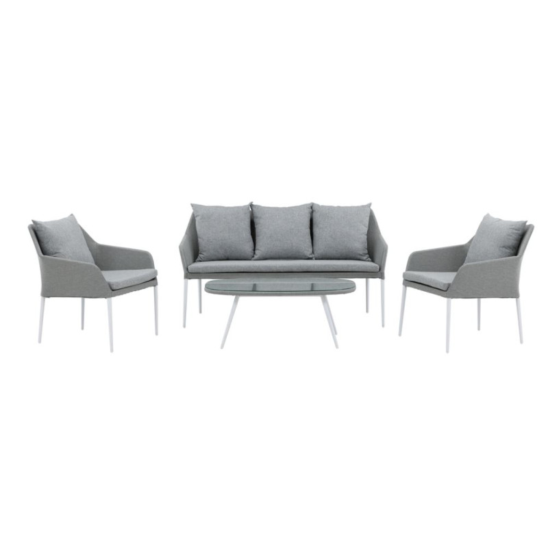 Spoga soffgrupp har en luftig design med raka nordiska former som kommer passa utmärkt på altanen eller i uterummet i sommar! Stommen är vit och sitsen tillverkad av grått tyg. Ett matchande soffbord tillkommer - möblera inbjudande och personligt!