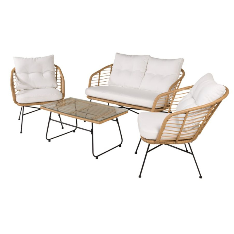 Stilren nätt soffgrupp i modern design som passar perfekt på den inglasade uteplatsen. Möbelgruppen består av en tvåsitssoffa, två karmfåtöljer tillverkat i en nätt ramställning i svart pulverlackerad metall samt rygg och sits är designat i ett stilrent nätt mönster av naturrotting. Inklusive vita dynor och ett soffbord med detaljer i wicker och en bordsskiva av glas. Inred uteplatsen med en lounge-grupp som garanterat kommer förlänga de sena sommarkvällarna tillsammans med nära och kära!