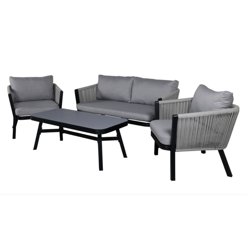Virya är en modern loungegrupp med inriktning på komfort - den passar perfekt på uteplatsen eller altanen. Möbelgruppen består av en tvåsitssoffa, två karmfåtöljer tillverkad i svart pulverlackerad metall med en rygg som är designad i ljusgrått rep.
