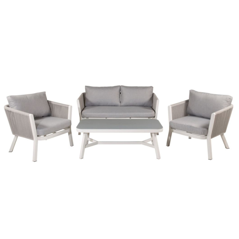 Virya Lounge set är en skön och snygg grupp i vit aluminium med tillhörande bord med en toppskiva i glas. Slitstarka dynor i grått ingår och gruppen rymmer totalt 4 sittande gäster. Bordets mått: 120x55x45,5 cm. Soffans mått: 77x72 cm. Sittmått: 60/133x65x34 cm. Enklare montering krävs.