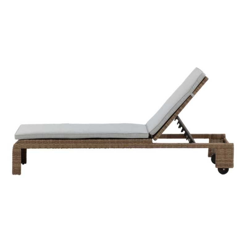 Skapa en lyxig oas på din uteplats i sommar med den här solsängen från serien London! Designen är genomtänk med en stilren look och praktiska funktioner. Här får du naturfärgad solsäng i konstrotting med vit dyna, hjul och justerbart ryggstöd. Välj själv om du vill sitta upp och läsa en bok eller sträcka ut dig i viloposition och njuta av värmen från solen. Skötselråd: Konstrotting är ett plastmaterial som passar alldeles utmärkt för vårt skandinaviska klimat. Materialet är UV-beständigt och tåler väder och vind. Att det är UV-beständigt gör att möblerna inte bleknas, däremot rekommenderar vi alltid att förvara möblerna under ett möbelskydd eller på annat vis torrt och svalt – för att förlänga livslängden.