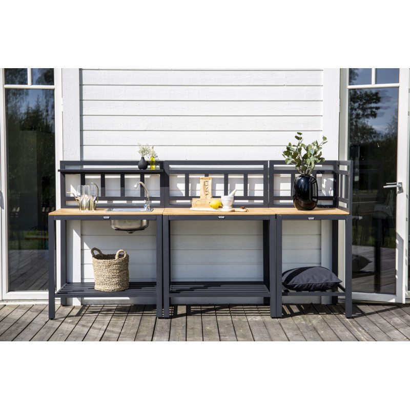 Laga maten utomhus och komplettera ditt utekök med den här praktiska modulen från serien Mexico. Mexico finns i flera olika modeller och moduler. Bänkskivan är tillverkad av stilren teak och matchas med svart stomme i aluminium. Kombinationen är lika klassisk som tidlös och kommer garanterat bli iögonfallande på din uteplats. Modulen erbjuder generös arbetsyta och smart förvaringslösning. Njut av sommarbrisen och spendera tiden ute. Skötselråd: Våra teakmöbler produceras av certifierad teak som är odlad för ändamålet och inte skövlade från ömtålig regnskog. Som ett av de tåligaste träslagen innehåller teak mycket olja som sedvanligt behövs för att inte materialet ska spricka. Eftersom träslaget innehåller naturligt mycket behöver inte möblerna impregneras lika ofta.