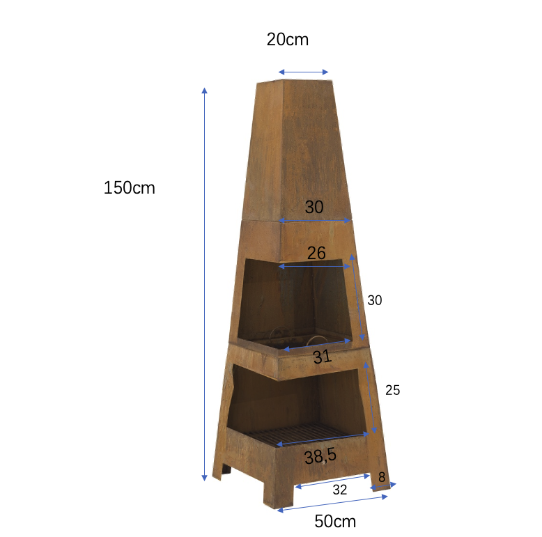 Höj stil- och mysfaktorn på din uteplats med denna värmande eldstad från serien Bastian. Den fyrkantiga kroppen som gradvis smalnar mot toppen ger en modern och rustik look, samtidigt som den rostiga stålytan bidrar till en autentisk, industriell känsla.