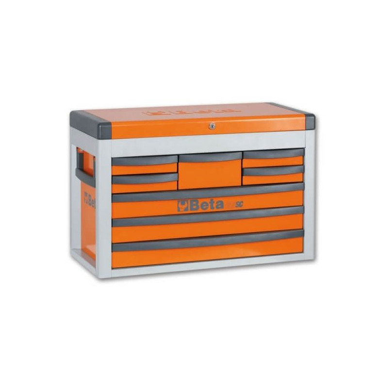 Robust verktygslåda i plåt från Beta Tools – 8 kullagrade lådor, låsbar front, infällbara handtag. Finns i orange, grå eller röd. Vikt 28 kg.