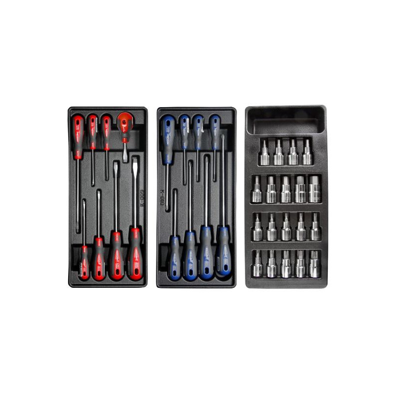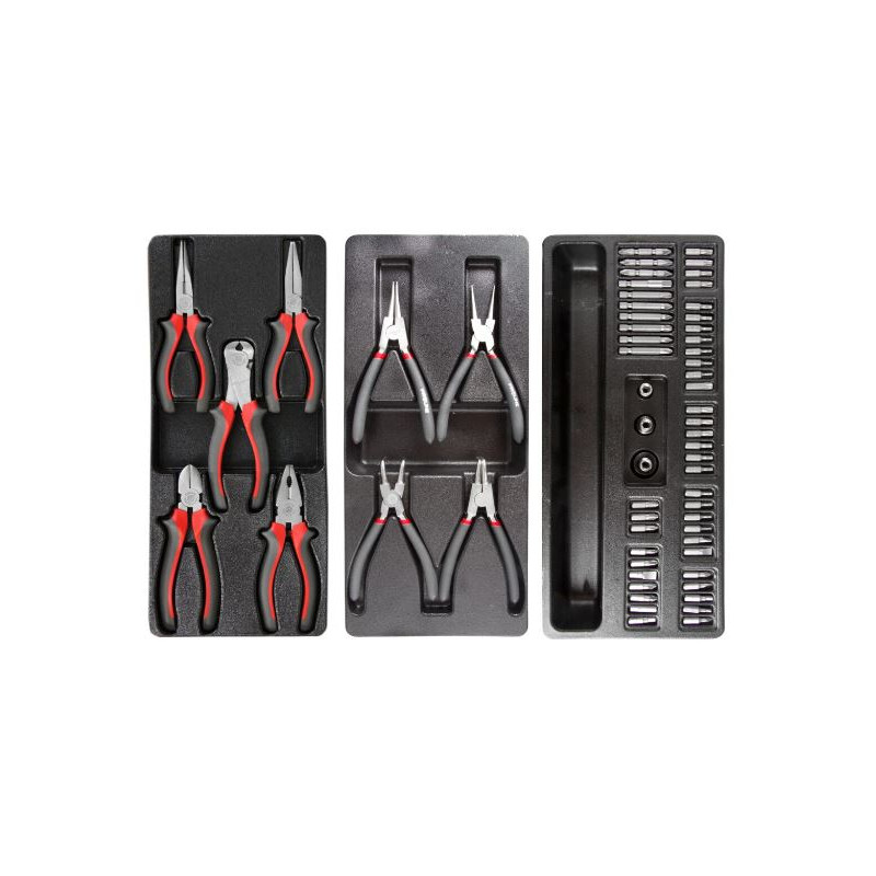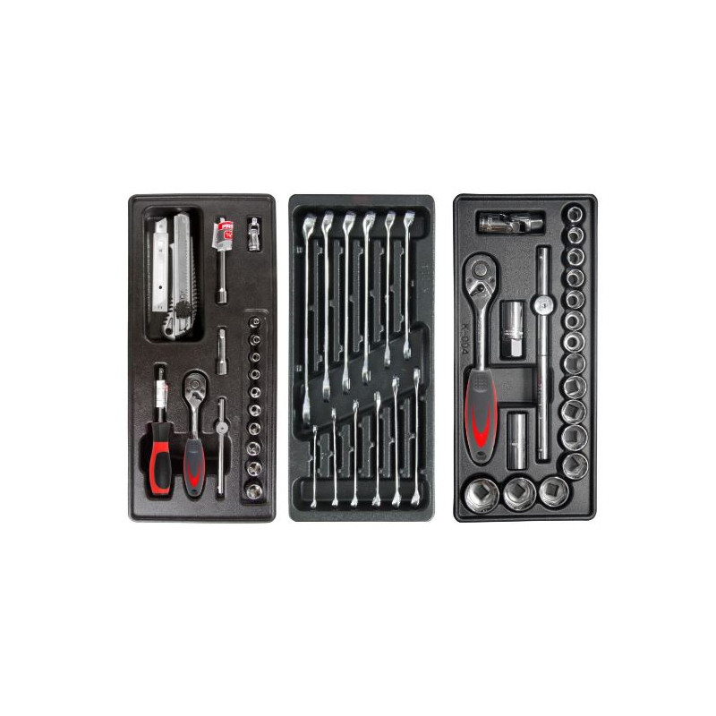 Verktygen är organiserade i lådinsatser för enkel åtkomst och överblick, vilket gör att du alltid har rätt verktyg nära till hands.