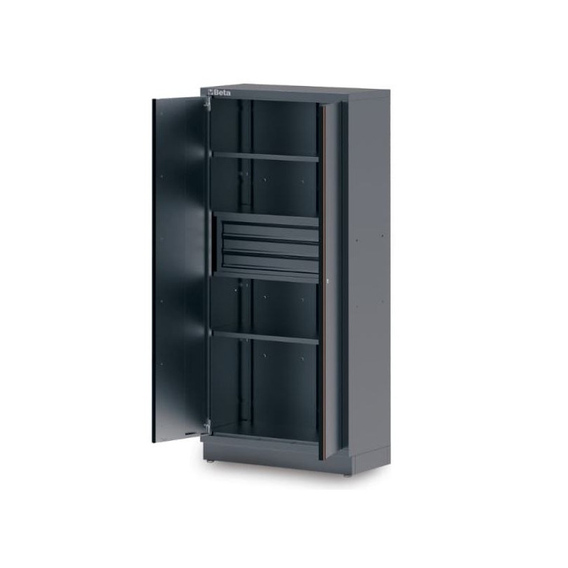 Beta Tools C45PRO 2.0 AS2/3C är ett verktygsskåp i plåt som kombinerar säker förvaring med smart organisering. Skåpet har två låsbara dörrar, tre integrerade lådor med kullagrade skenor och fyra justerbara hyllplan. Med robust konstruktion och flexibel inredning är det en perfekt del av C45PRO 2.0-systemet eller som en fristående enhet i garage och verkstäder.