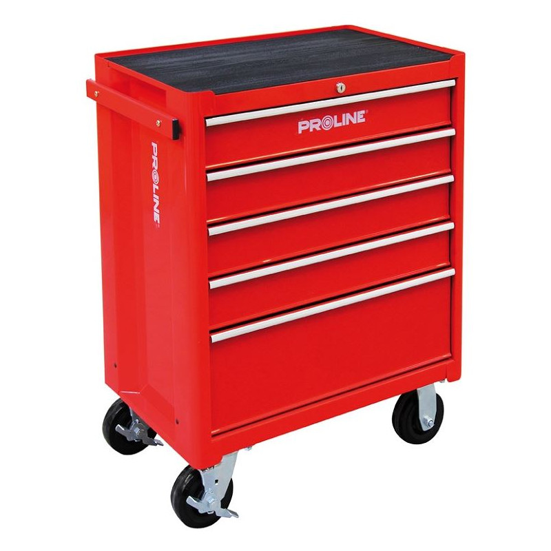 Robust verktygsvagn med 5 lådor och 193 verktyg. Proline med centrallås, kullagrade lådor (35 kg kapacitet), 100 mm hjul med broms – perfekt för professionella verkstäder.