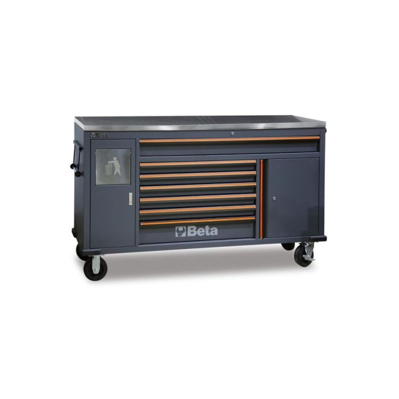 Beta C45PRO 2.0 MWS/X är en kraftfull rullande arbetsstation med rostfri arbetsyta i MDF, sju lådor, integrerad avfallsbehållare och pappersrullehållare. Den är designad för professionella verkstäder och industriella miljöer där rörlighet, hållbarhet och ordning är avgörande. Med sina stora industrihjul är den lätt att förflytta, även med tung last.